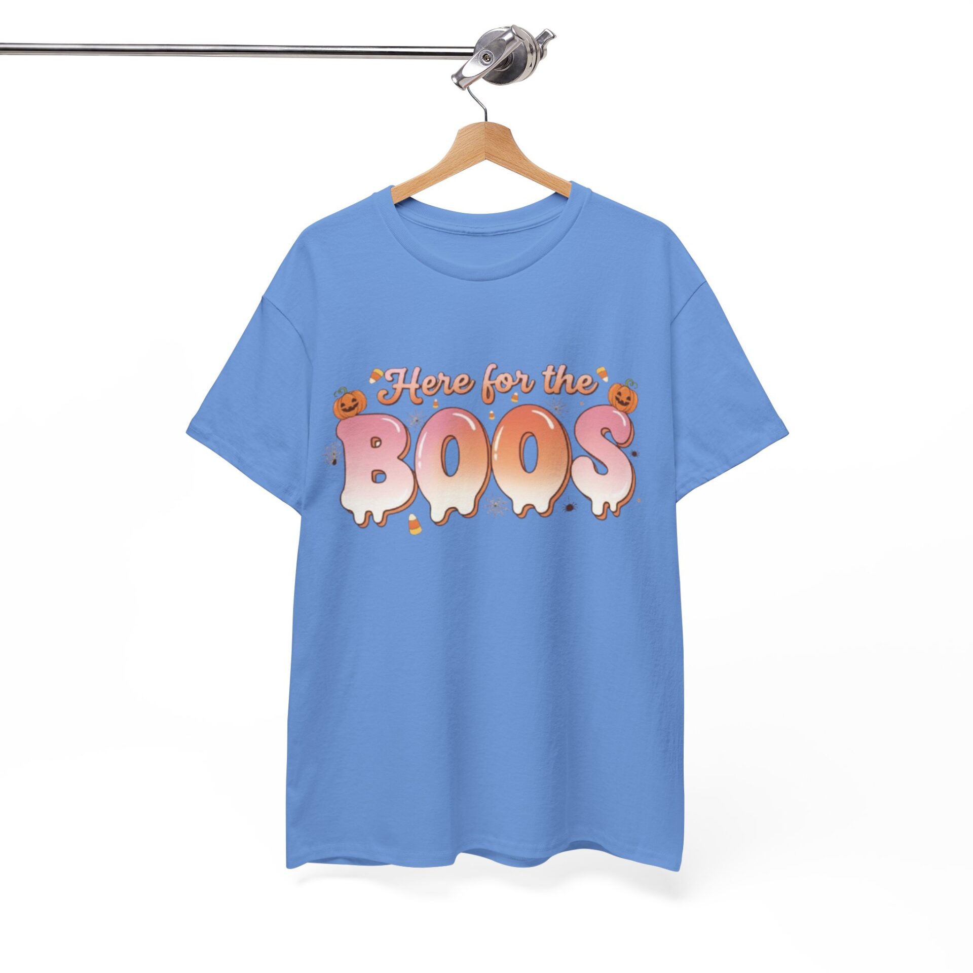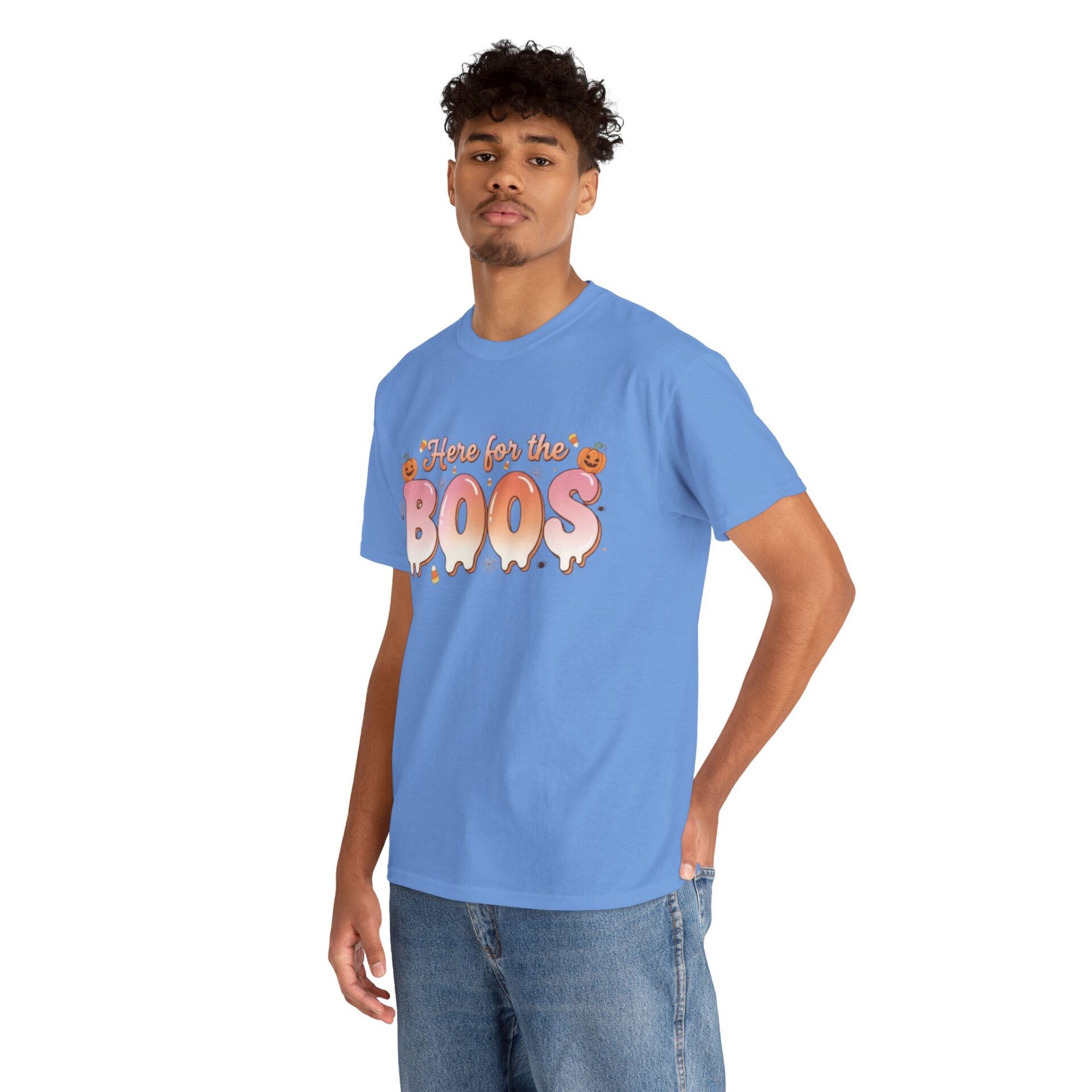 About Here for the Boos Halloween T-Shirt—Funny Ghost Party Shirt, Unisex Heavy Cotton Tee, Cute Couples Matching Outfit for Spooky Season.