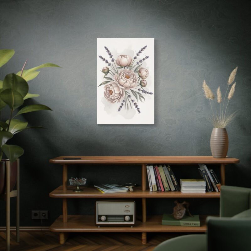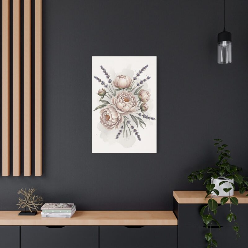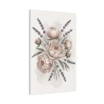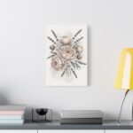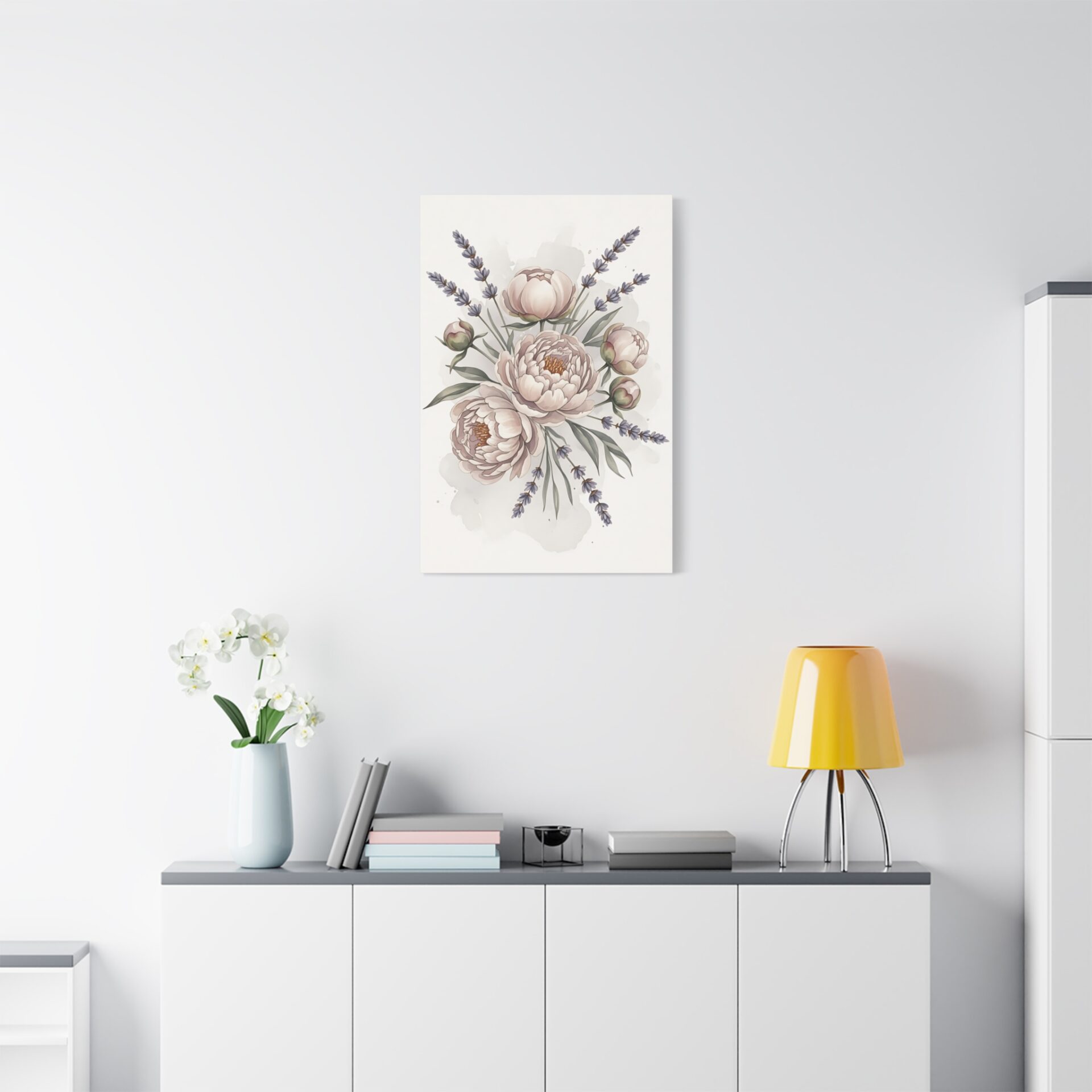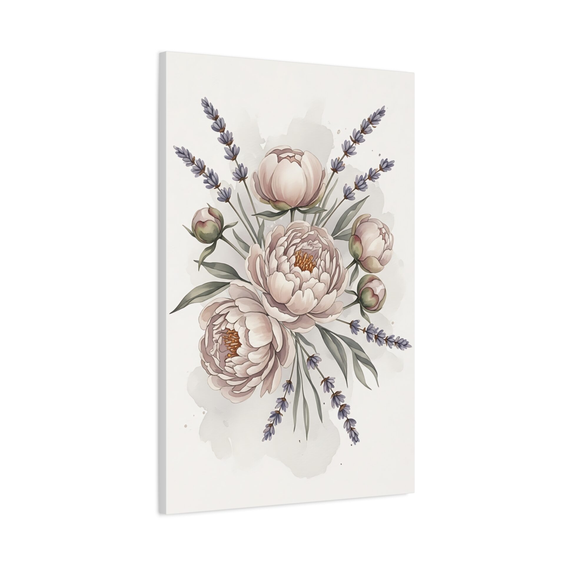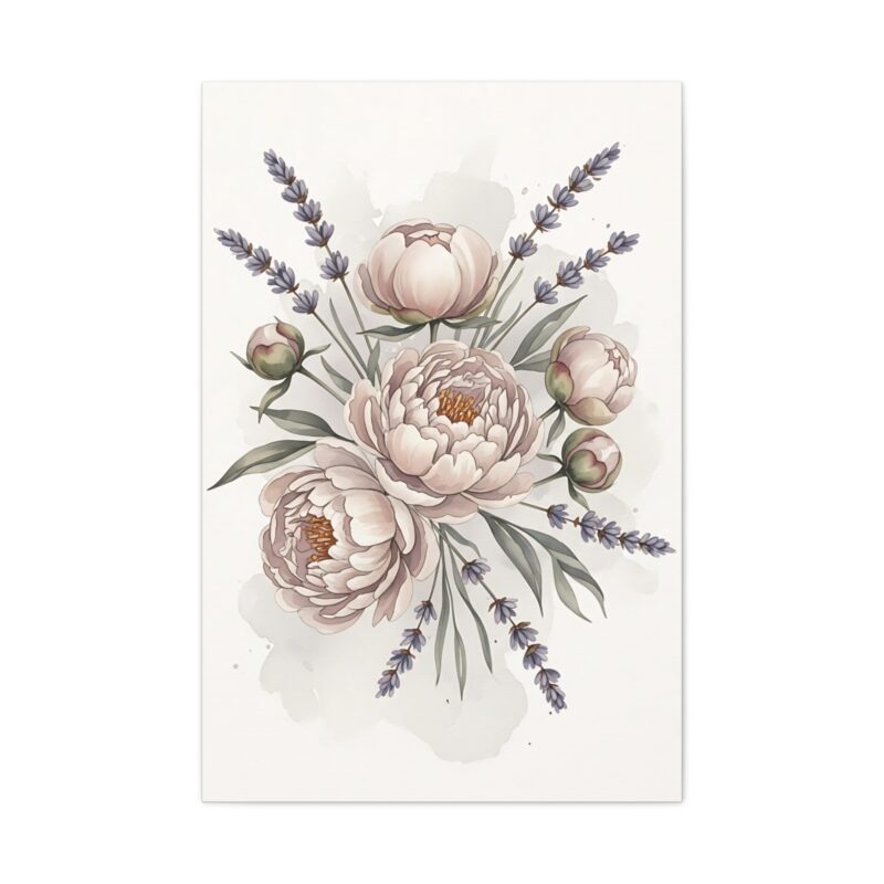 Bring a touch of soft elegance to your walls with this Peony & Lavender Watercolor Canvas Wall Art. Featuring a delicate arrangement of blooming peonies and dried lavender, this artwork is rendered in pastel beige and ivory with a hand-painted watercolor effect. The gentle tones and feminine design make it a timeless addition to any interior.